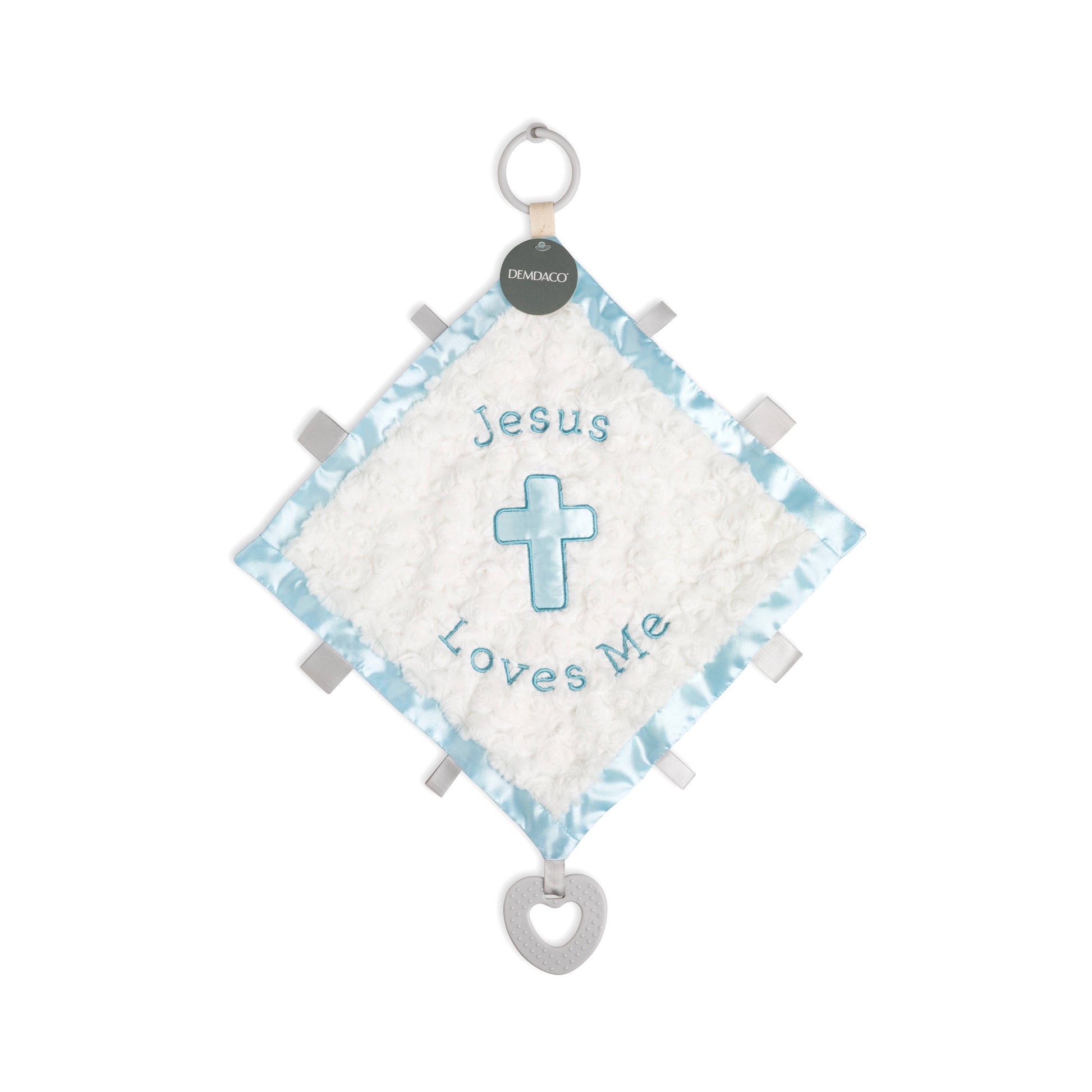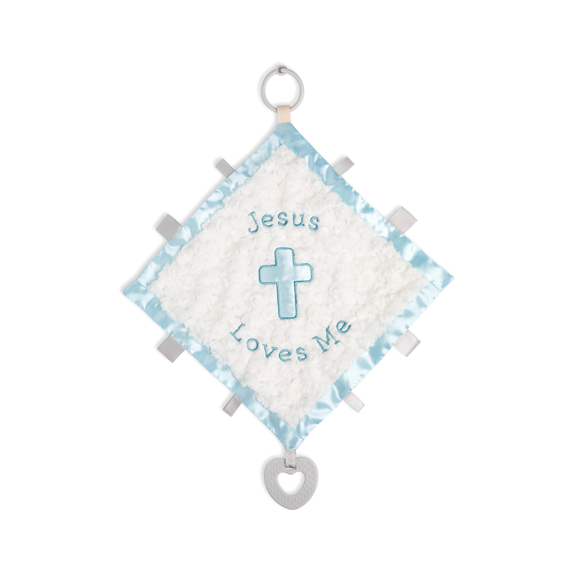 Soft and snuggly, the Jesus Loves Me Activity Blankie - Blue from the Activity Blankie collection is sure to be baby's new favorite toy! With an inspirational sentiment on the front that reads, "Jesus loves me," this blue, baby blanket will quickly become a playtime essential.