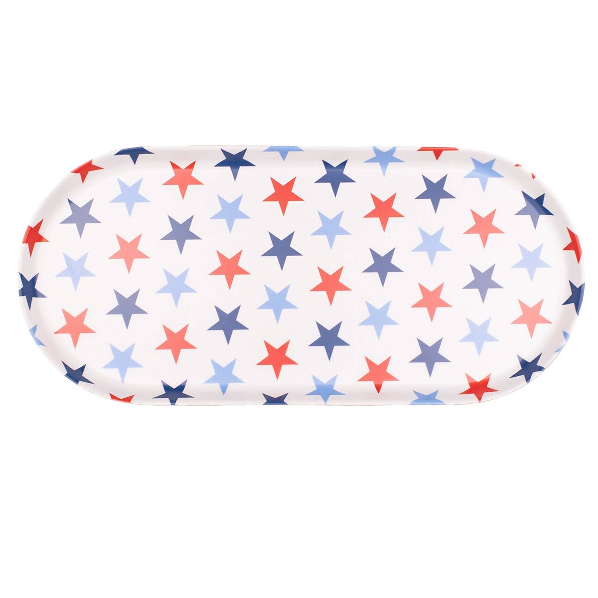 This Stars Melamine Platter in white, red, and blue measures 17.5 x 8 inches, making it the perfect size for serving appetizers or snacks. Made of durable melamine, this platter is both shatterproof and dishwasher safe, making it an excellent addition to any outdoor gathering or casual event. Search Keywords: